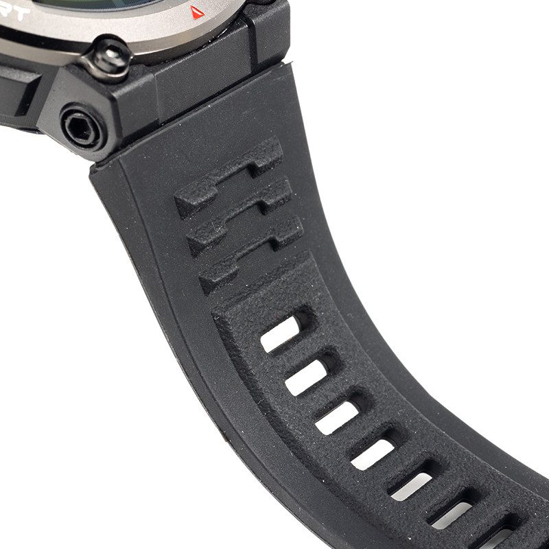بدنه ساعت استیل ضد زنگ به رنگ مشکی و دارای یک بند سیلیکونی مشکی با سگک قلاب دار